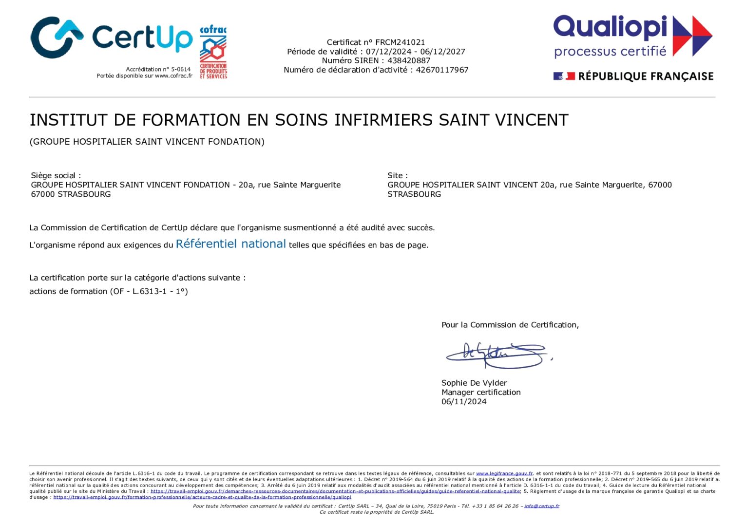 L'IFSI Saint Vincent est certifié par Qualiopi